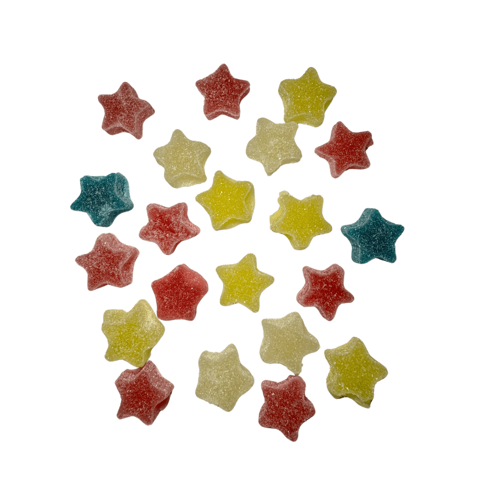 Stella Bites, are chewy sugar coated stars with fruit cocktail flavour. They contain 350mg per pack.